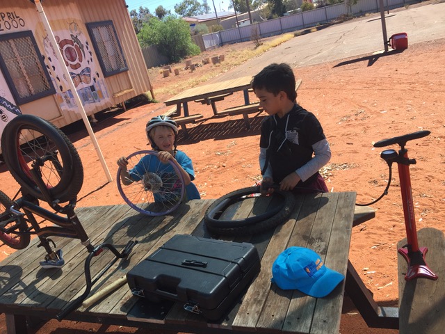 The next day word was out with attendance escalating with the original group reattending in addition to the arrival of several other excited and eager youths. The local Double Gee thorns provided ample opportunity to teach the riders how to change and repair a flat tyre, with one child being particularly helpful in teaching the others, fulfilling a mentoring and role. The schedule comprised skills training and more fun with unstructured play and cycling going hand in hand.