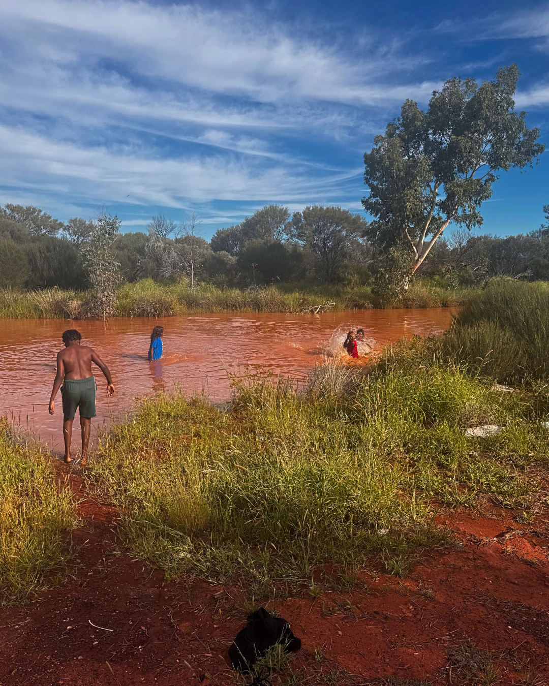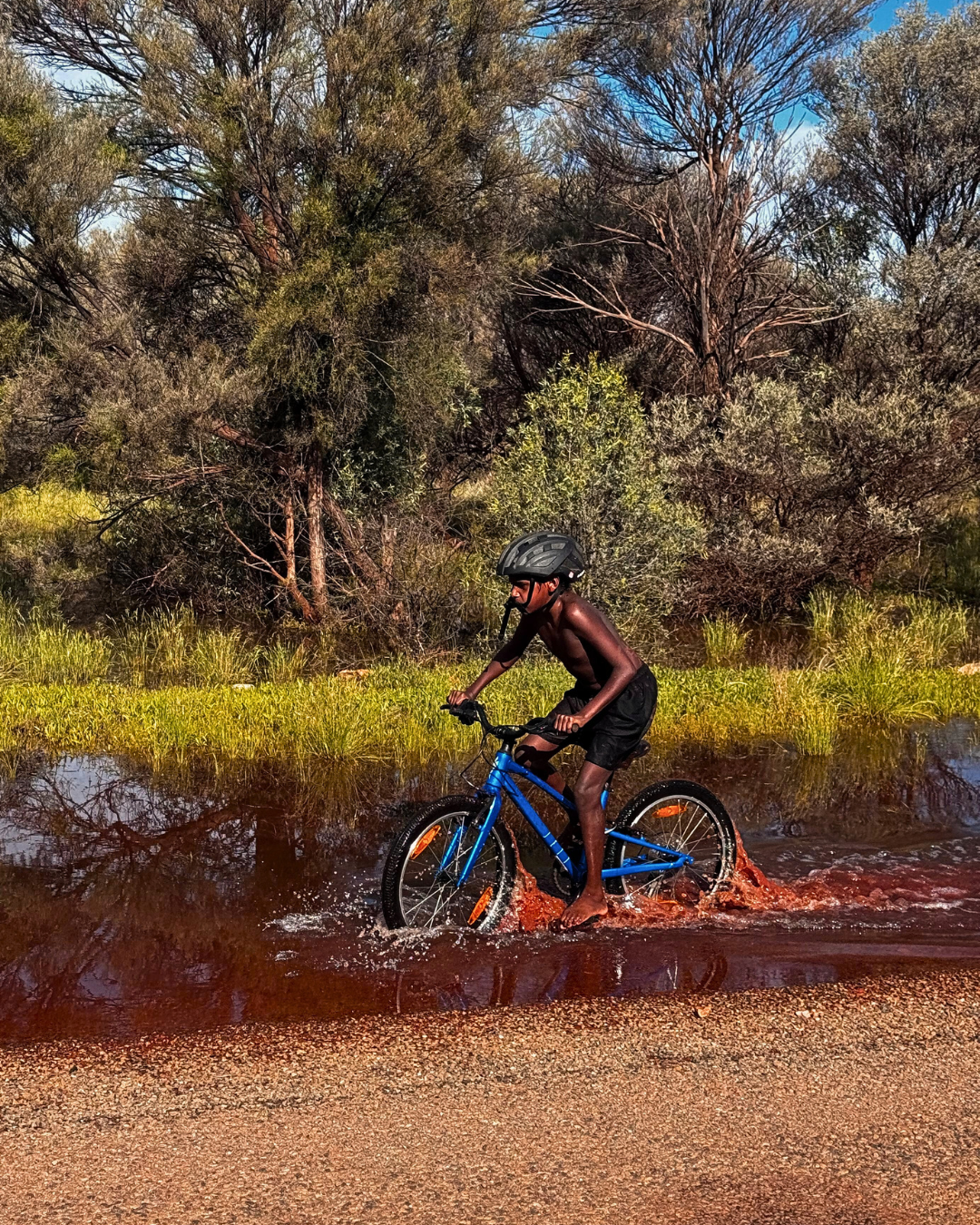 Rides quickly turned into longer excursions, heading out to the local racecourse where “some horses were curiously engaging with the kids,” alongside time spent riding through leftover flood waters nearby. This kind of stuff is not structured in a traditional sense, but that’s the point: sessions shaped by place, conditions, and what the kids are drawn to on the day.
