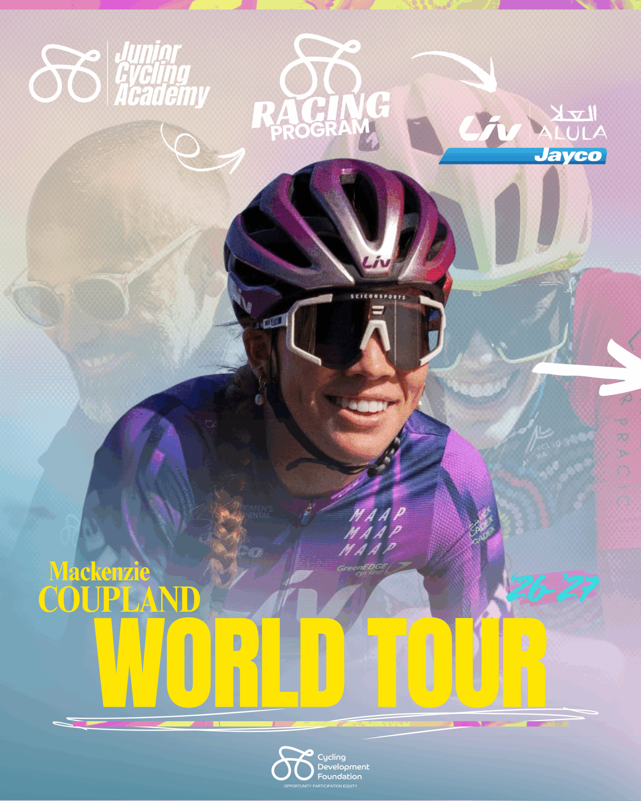 The Cycling Development Foundation (CDF) is proud to congratulate former rider Mackenzie Coupland on signing with the Liv AlUla Jayco World Tour Team for the 2026 and 2027 seasons. This marks another major step in Mackenzie’s incredible journey from our Junior Cycling Academy through to the pinnacle of women’s professional cycling.