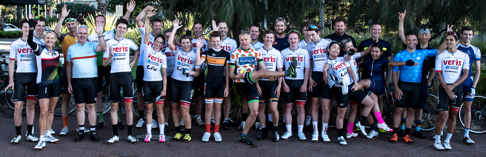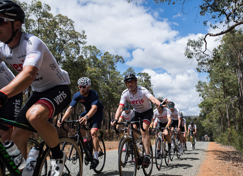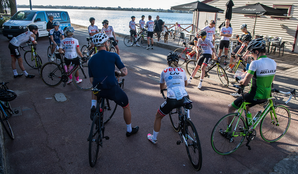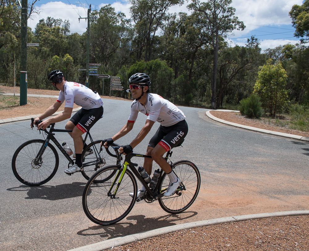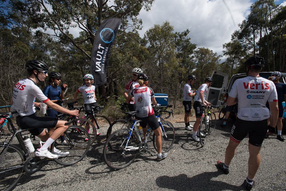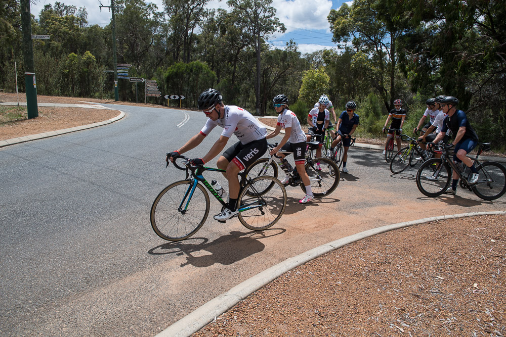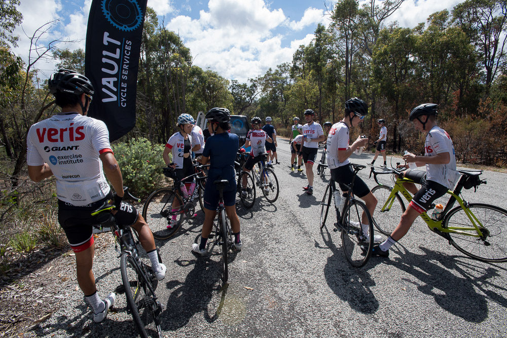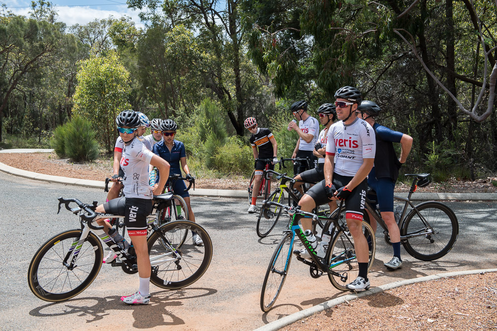 Approximately 27 attendees departed for a challenging 120km loop through the Perth Hills. Two groups formed on the road, one averaging around 28km/hr and the other close to 31km/hr across 1300meters of climbing elevation. Veris Racing athletes were on hand to assist and pace participants across the course.